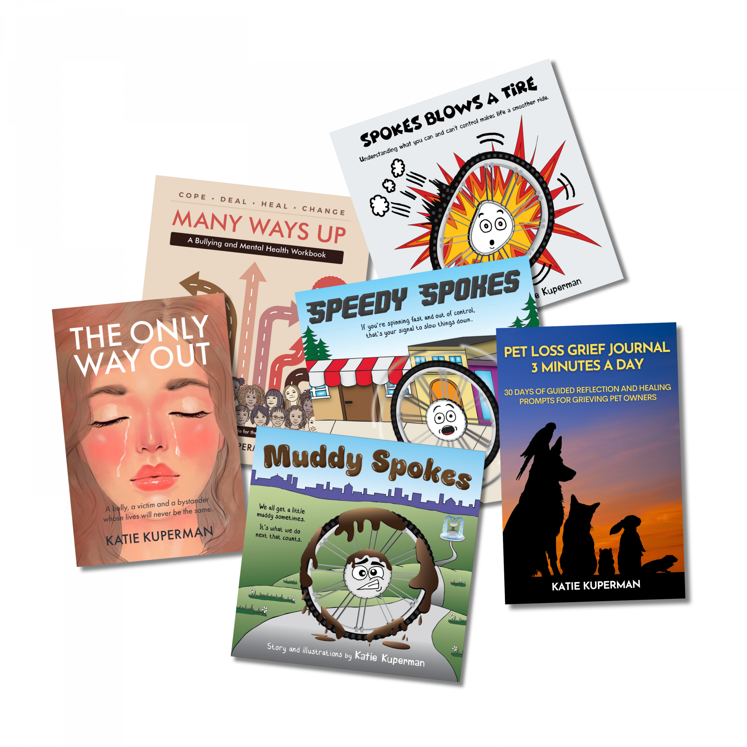 In the young adult space, The Only Way Out is a novel and Many Ways Up is a workbook about bullying and mental health. I have three children’s books – Muddy Spokes, Speedy Spokes and Spokes Blows a Tire – each using humor and a cute bicycle wheel character to tell fun stories that teach kids how to be resilient and manage their big emotions. And for adult readers, I created The Pet Loss Grief Journal, a short book and journal with daily insights and prompts inspired by my deep, personal life experience.